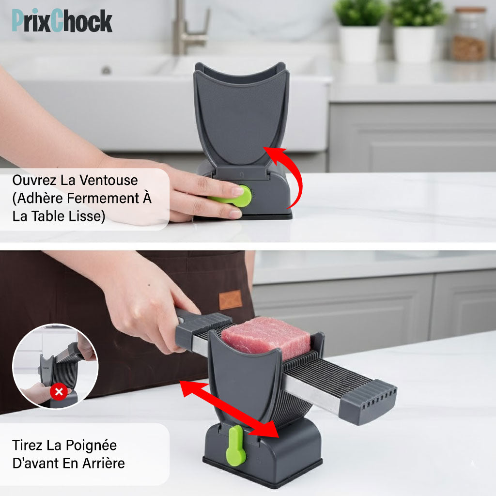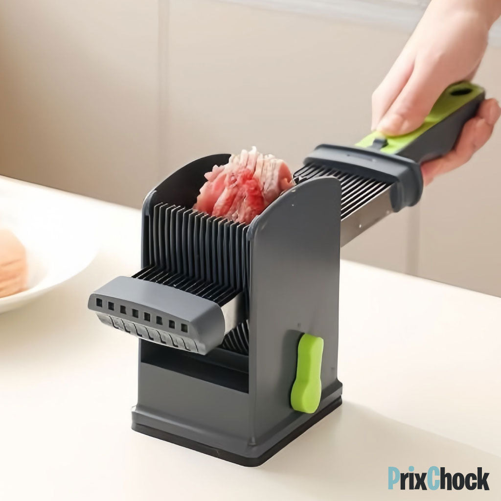 - Utilisation simple – Il suffit de placer la viande et de faire glisser le couteau.